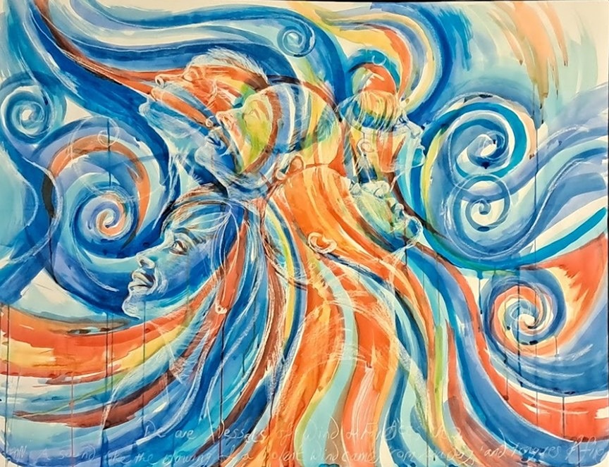 In Spring 2025, in California, I painted Jesus running through a barren desert, his arm outstretched behind him towards us, inviting us to come run with him! His garments are a river running out from behind him bringing renewal and life and healing in his wake.
